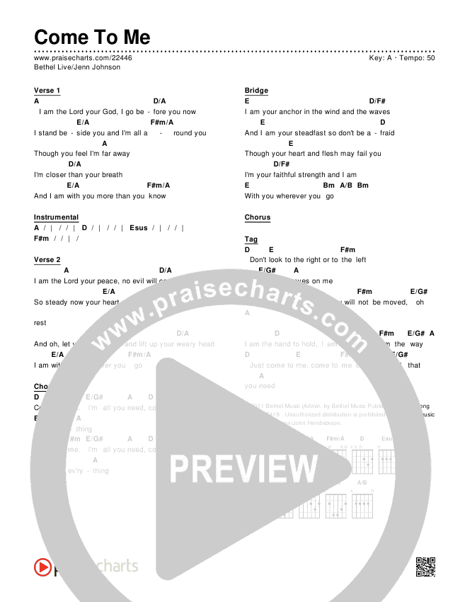 Download the PDF Chord Charts for Come To Me by Bethel Music / Jenn Johnson, from the album The Loft Sessions. This song was arranged by John Wasson / Grant Wall in the key of A, Bb.
