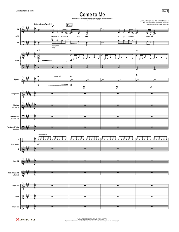 Download the Orchestration for Come To Me by Bethel Music / Jenn Johnson, from the album The Loft Sessions. This song was arranged by John Wasson / Grant Wall in the key of A, Bb.