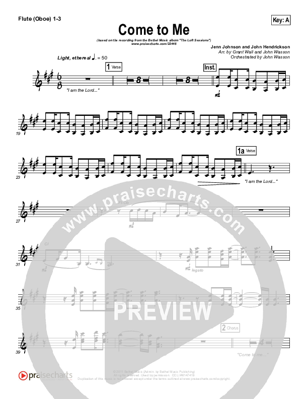 Download the Orchestration wind parts for Come To Me by Bethel Music / Jenn Johnson, from the album The Loft Sessions. This song was arranged by John Wasson / Grant Wall in the key of A, Bb.