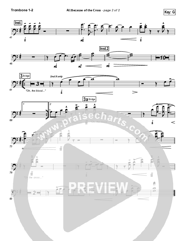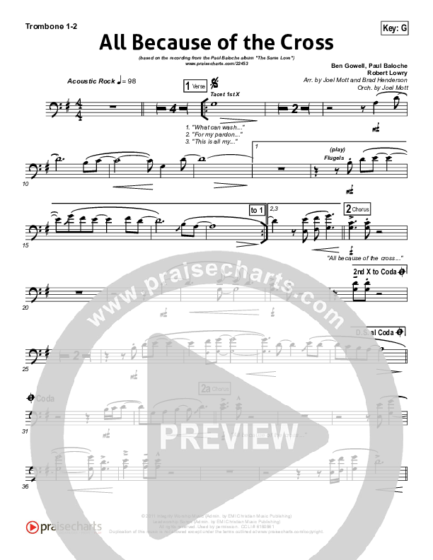 Download the Trombone 1,2 sheet music for All Because Of The Cross by Paul Baloche, from the album The Same Love. This song was arranged by Joel Mott / Brad Henderson in the key of F, G.