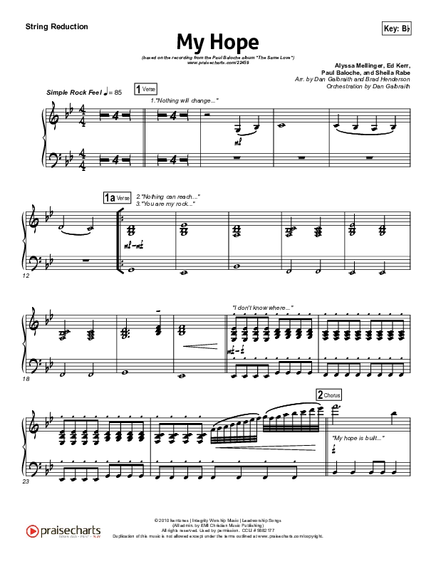 Download the Orchestration string parts for My Hope by Paul Baloche, from the album The Same Love. This song was arranged by Daniel Galbraith / Brad Henderson in the key of A, Bb.