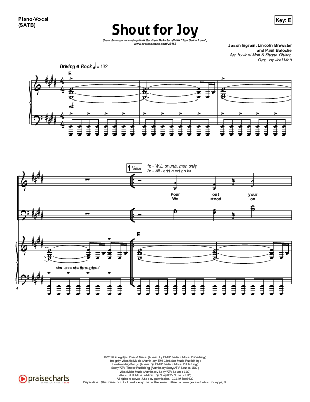 Download the sheet music for Shout For Joy by Paul Baloche, from the album The Same Love. This song was arranged by Joel Mott / Shane Ohlson in the key of E, Eb.