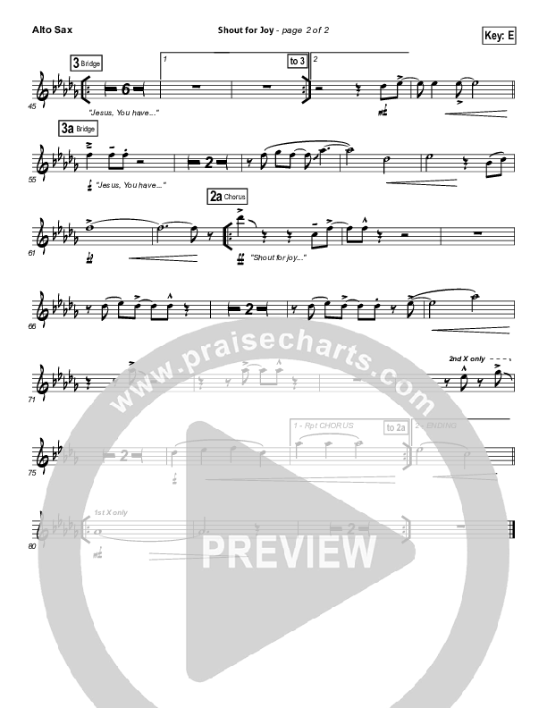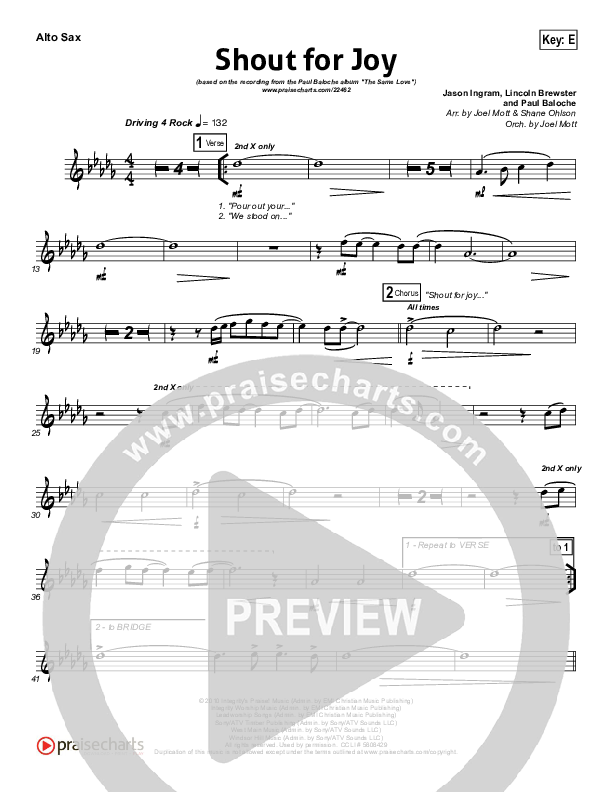 Download the AltoSax sheet music for Shout For Joy by Paul Baloche, from the album The Same Love. This song was arranged by Joel Mott / Shane Ohlson in the key of E, Eb.