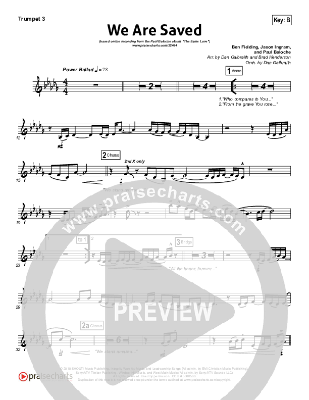 Download the Trumpet 3 sheet music for We Are Saved by Paul Baloche, from the album The Same Love. This song was arranged by Daniel Galbraith in the key of B, Bb.