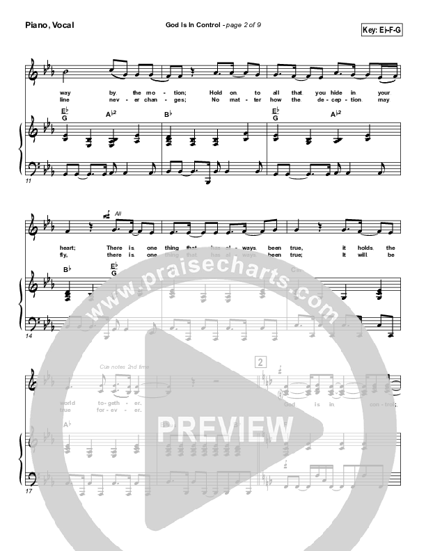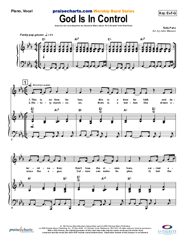 Download the sheet music for God Is In Control by Twila Paris, from the album He Is Exalted. This song was arranged by John Wasson in the key of D, Eb.