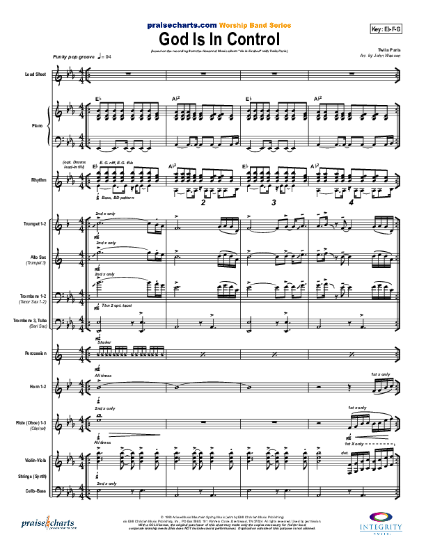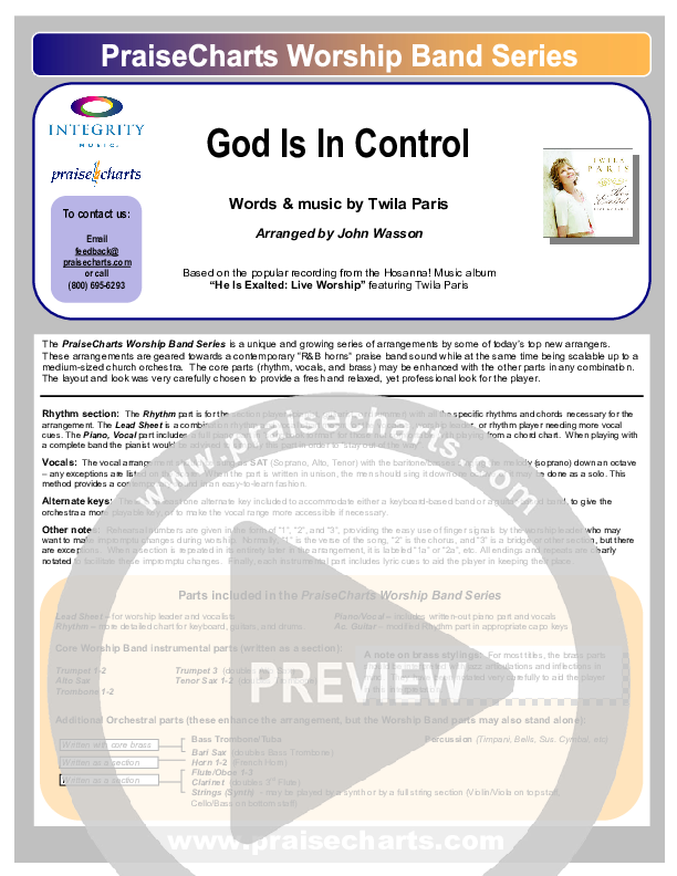 Download the Orchestration for God Is In Control by Twila Paris, from the album He Is Exalted. This song was arranged by John Wasson in the key of D, Eb.