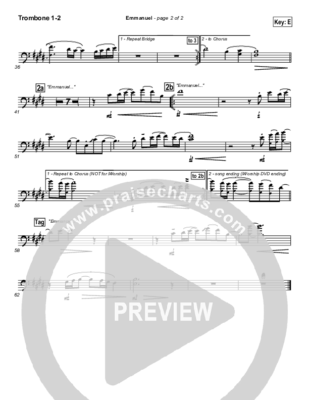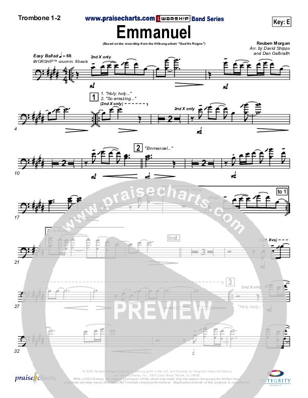 Download the Trombone 1,2 sheet music for Emmanuel by Hillsong Worship, from the album iWorship: A Christmas Offering. This song was arranged by David Shipps / Daniel Galbraith in the key of E, Eb.