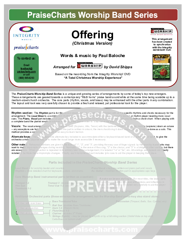Download the Orchestration for Offering (Christmas) by Paul Baloche, from the album iWorship: A Christmas Offering. This song was arranged by David Shipps in the key of E, F.