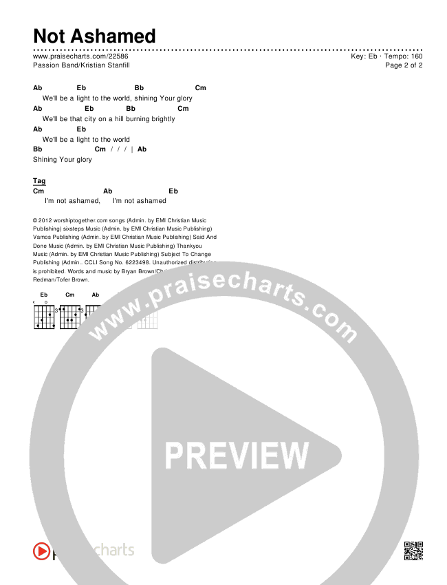 Download the PDF Chord Charts for Not Ashamed by Passion / Kristian Stanfill, from the album White Flag. This song was arranged by Daniel Galbraith in the key of D, Eb.