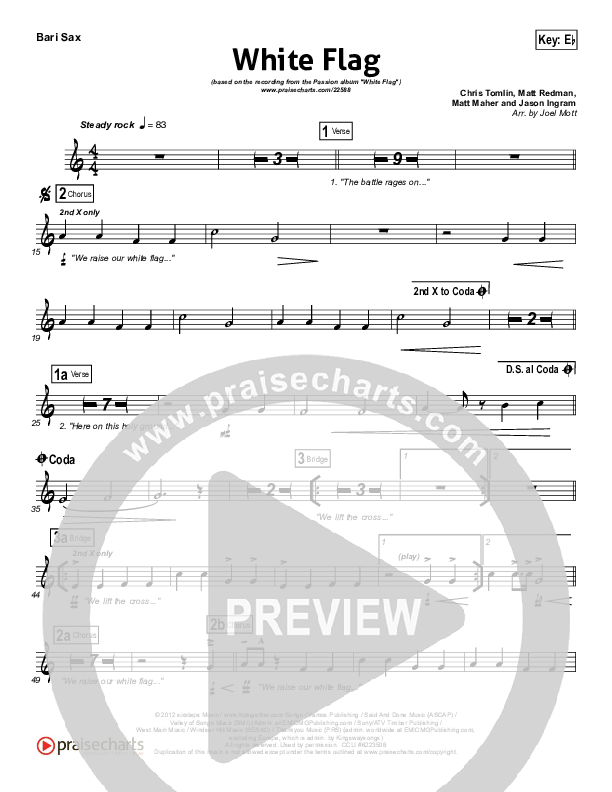 Download the Bari Sax sheet music for White Flag by Chris Tomlin / Passion, from the album White Flag. This song was arranged by Joel Mott in the key of D, Eb.