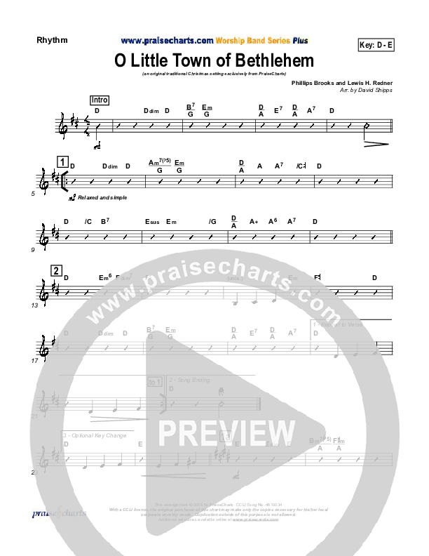Download the Rhythm Chart for O Little Town Of Bethlehem by Traditional Carol / PraiseCharts, from the album Traditional Carols Collection. This song was arranged by David Shipps in the key of D, Eb.
