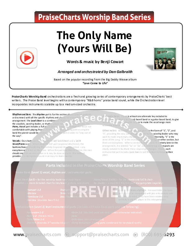 Download the Orchestration for The Only Name (Yours Will Be) by Big Daddy Weave, from the album Love Come To Life. This song was arranged by Daniel Galbraith in the key of B, Bb.
