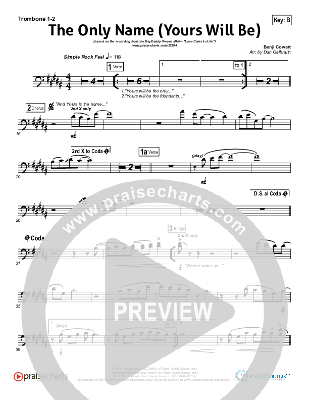 Download the Trombone 1,2 sheet music for The Only Name (Yours Will Be) by Big Daddy Weave, from the album Love Come To Life. This song was arranged by Daniel Galbraith in the key of B, Bb.