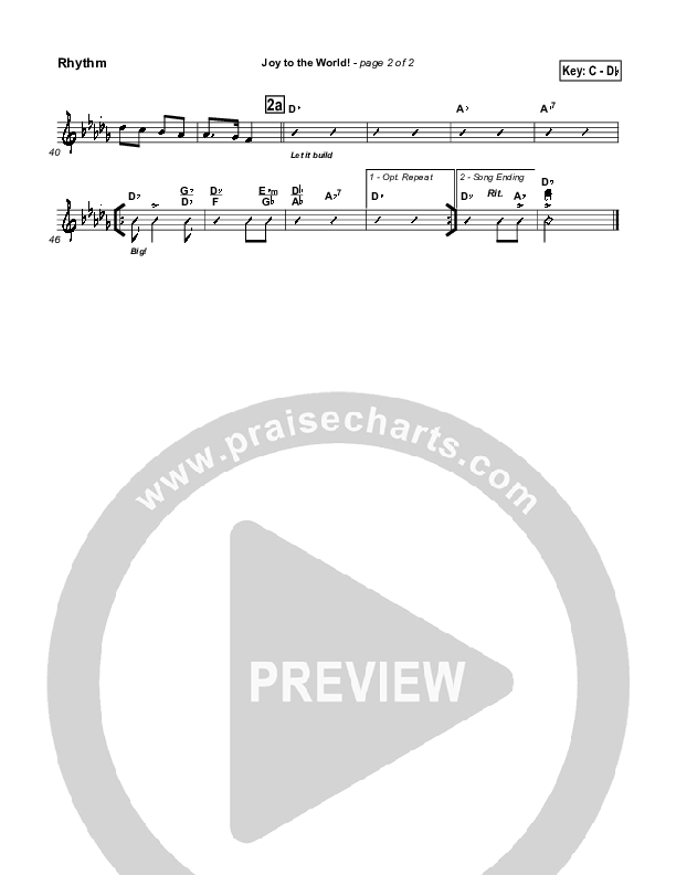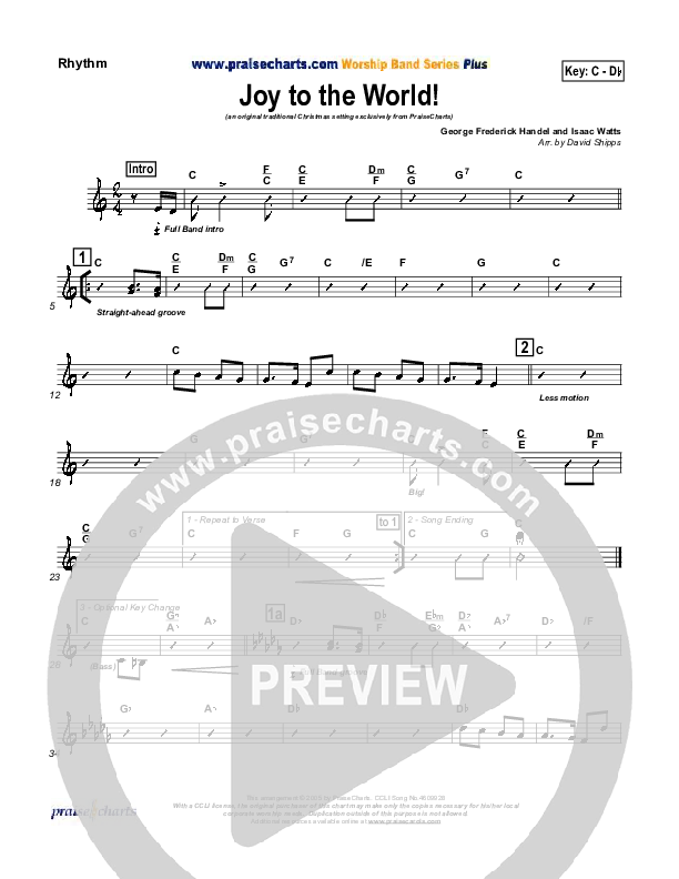 Download the Rhythm Chart for Joy To The World by Traditional Carol / PraiseCharts, from the album Traditional Carols Collection. This song was arranged by David Shipps in the key of C, D.