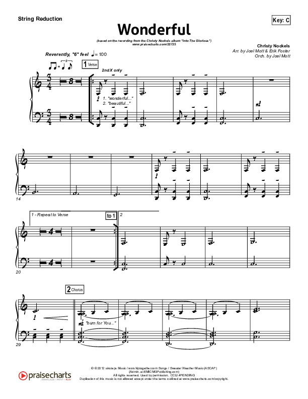 Download the Orchestration string parts for Wonderful by Christy Nockels, from the album Into The Glorious. This song was arranged by Joel Mott / Erik Foster in the key of C, D.