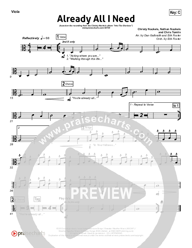 Download the Viola sheet music for Already All I Need by Christy Nockels, from the album Into The Glorious. This song was arranged by Daniel Galbraith / Erik Foster in the key of C, D.