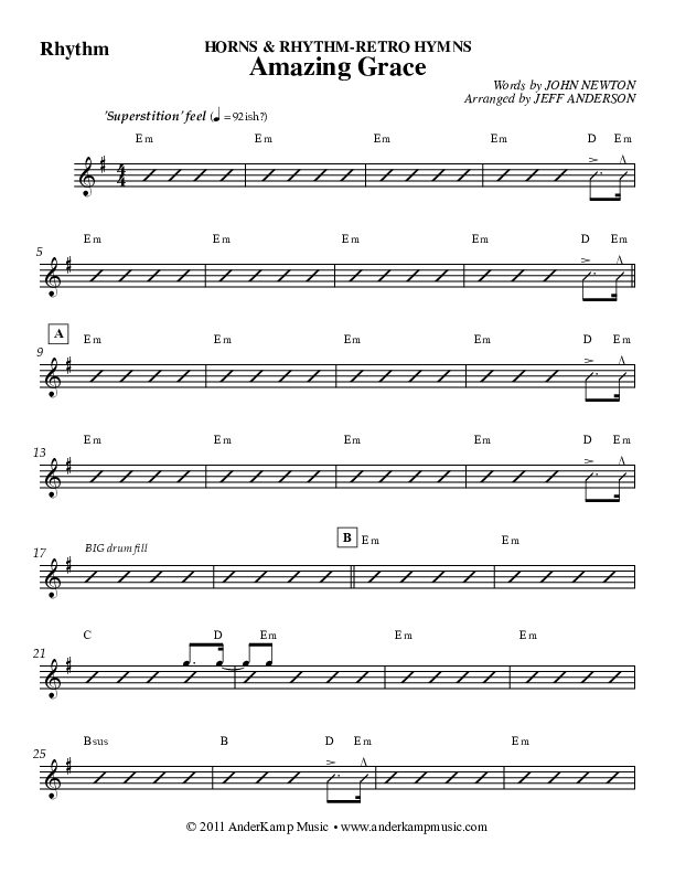 Download the Rhythm Chart for Amazing Grace (Instrumental) by Jeff Anderson, from the album Retro Hymns. This song was arranged by Jeff Anderson in the key of G.