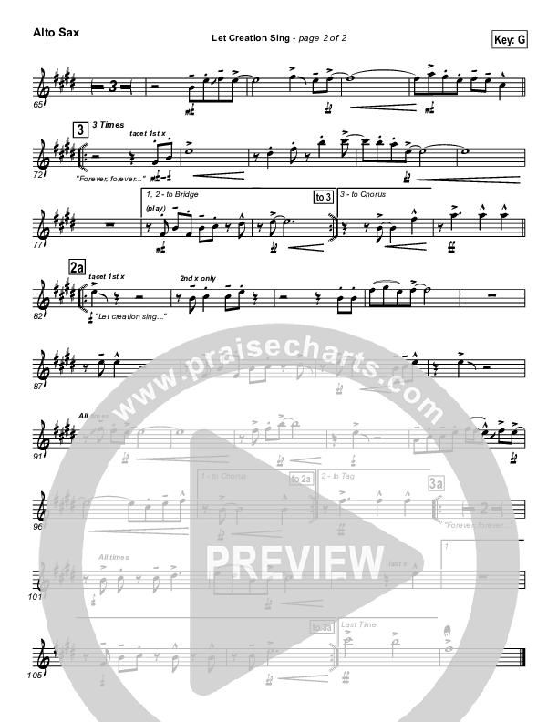 Download the AltoSax sheet music for Let Creation Sing by Hillsong Worship, from the album God He Reigns. This song was arranged by John Wasson in the key of F, G.