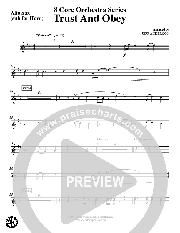 Download the AltoSax sheet music for Trust And Obey by Jeff Anderson, from the album 8 Core Orchestra. This song was arranged by Jeff Anderson in the key of F.