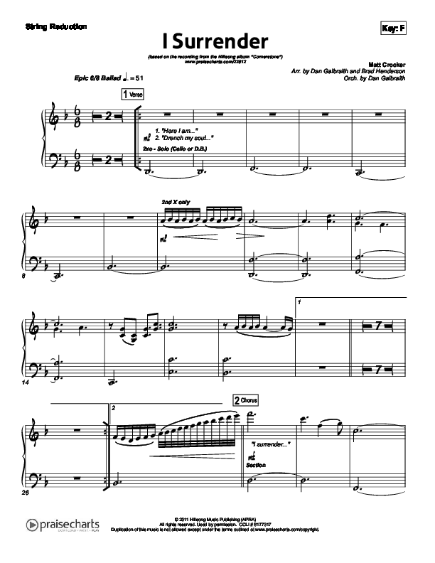 Download the Orchestration for I Surrender by Hillsong Worship, from the album Cornerstone (Deluxe). This song was arranged by Daniel Galbraith / Brad Henderson in the key of E.