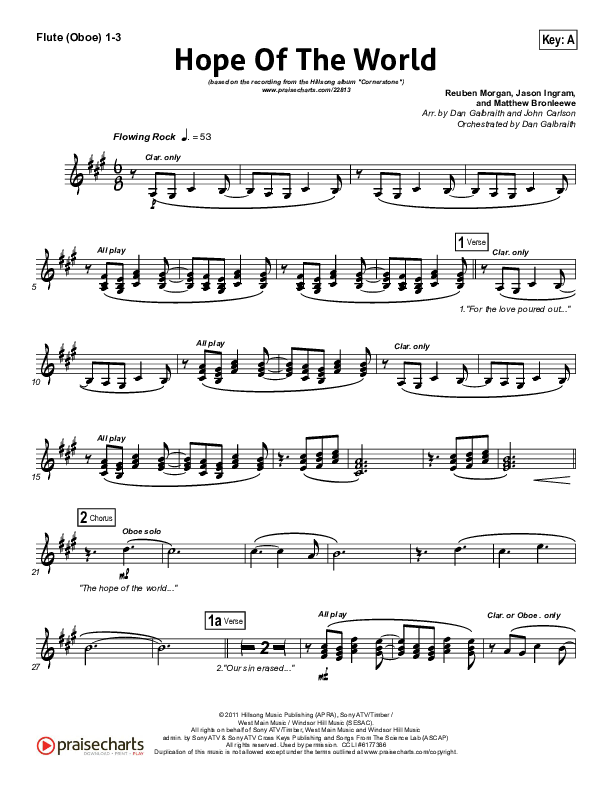 Download the Orchestration wind parts for Hope Of The World by Hillsong Worship, from the album Cornerstone (Deluxe). This song was arranged by Daniel Galbraith / John Carlson in the key of A, Bb.