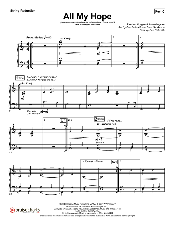 Download the Orchestration for All My Hope by Hillsong Worship, from the album Cornerstone (Deluxe). This song was arranged by Daniel Galbraith / Brad Henderson in the key of C, D.