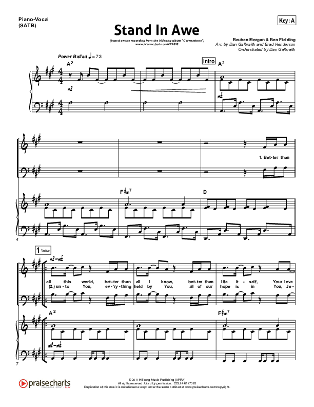 Download the sheet music for Stand In Awe by Hillsong Worship, from the album Cornerstone (Deluxe). This song was arranged by Daniel Galbraith / Brad Henderson in the key of A, G.