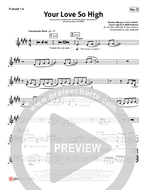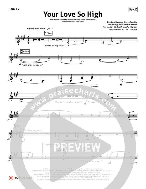 Download the Orchestration brass parts for Your Love So High by Hillsong Worship, from the album Cornerstone (Deluxe). This song was arranged by Daniel Galbraith / John Carlson in the key of C, D.