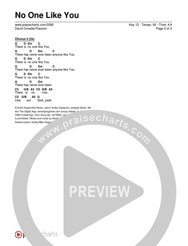 Download the PDF Chord Charts for No One Like You by David Crowder / Passion, from the album Passion: How Great Is Our God. This song was arranged by Erik Foster / Charlie Sinclair in the key of F, G.