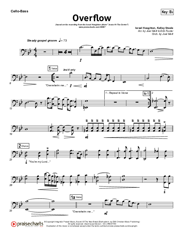 Download the Orchestration for Overflow by Israel Houghton, from the album Jesus At The Center. This song was arranged by Joel Mott / Erik Foster in the key of A, Bb.