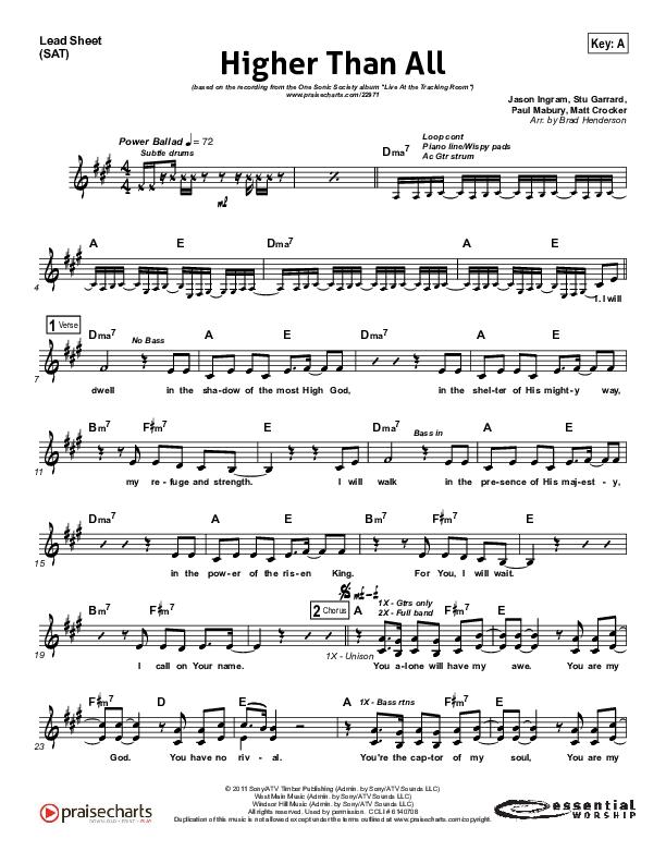 Download the sheet music for Higher Than All by One Sonic Society, from the album Live From The Tracking Room. This song was arranged by Brad Henderson in the key of A, Ab.