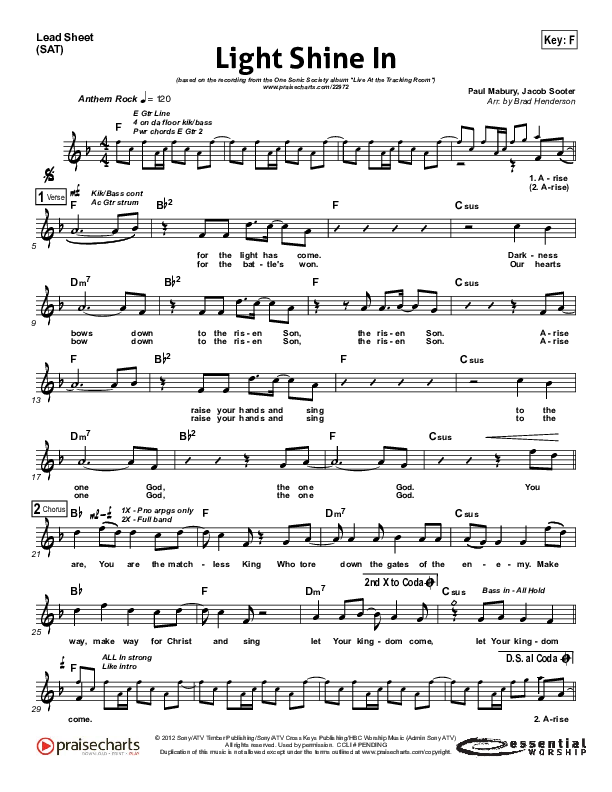 Download the sheet music for Light Shine In by One Sonic Society, from the album Live From The Tracking Room. This song was arranged by Brad Henderson in the key of E, F.