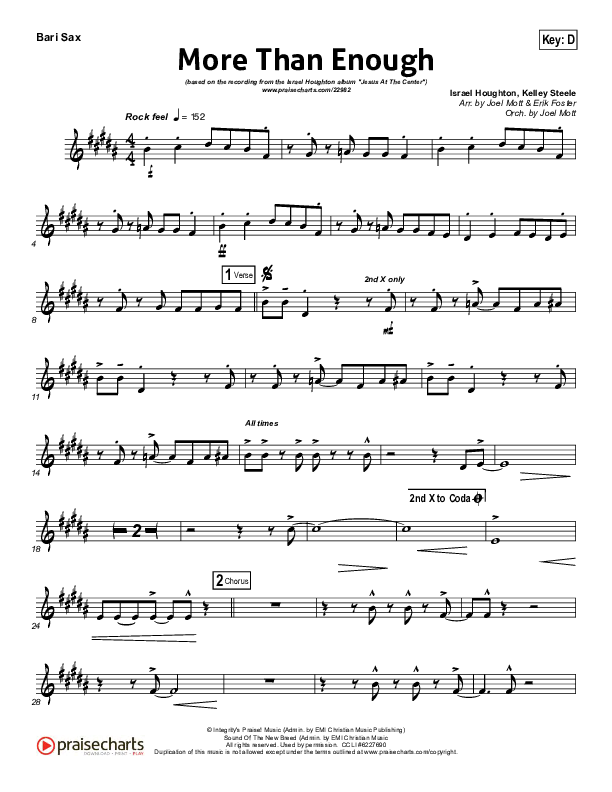 Download the Bari Sax sheet music for More Than Enough by Israel Houghton, from the album Jesus At The Center. This song was arranged by Joel Mott / Erik Foster in the key of C, D.