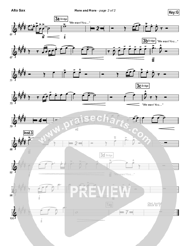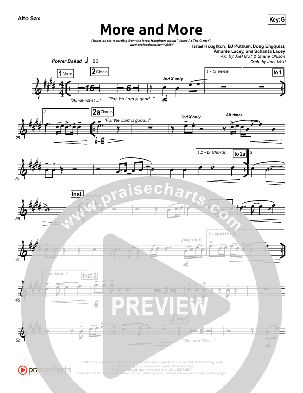Download the AltoSax sheet music for More And More by Israel Houghton, from the album Jesus At The Center. This song was arranged by Joel Mott / Erik Foster in the key of F, G.