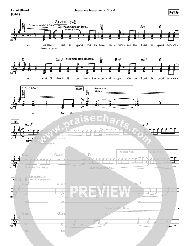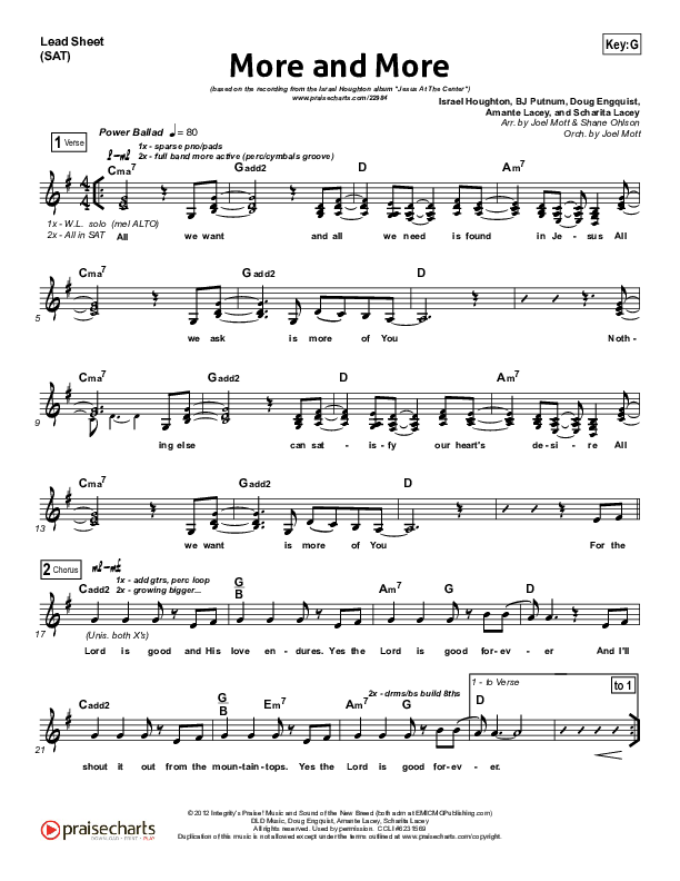 Download the Orchestration for More And More by Israel Houghton, from the album Jesus At The Center. This song was arranged by Joel Mott / Erik Foster in the key of F, G.
