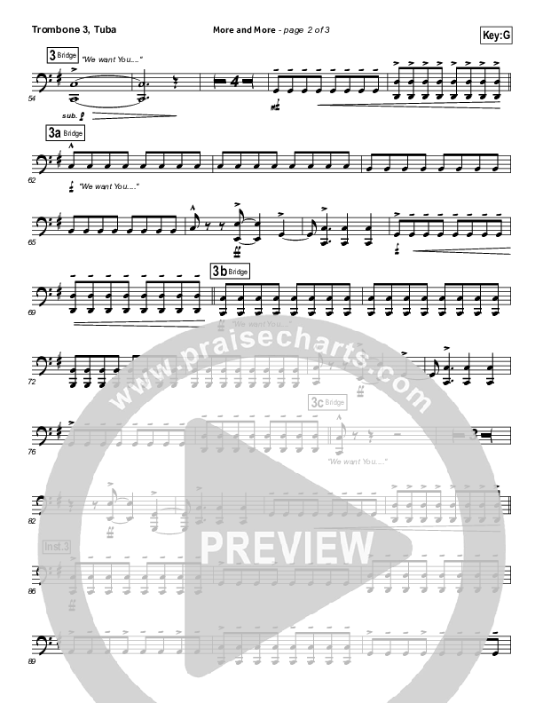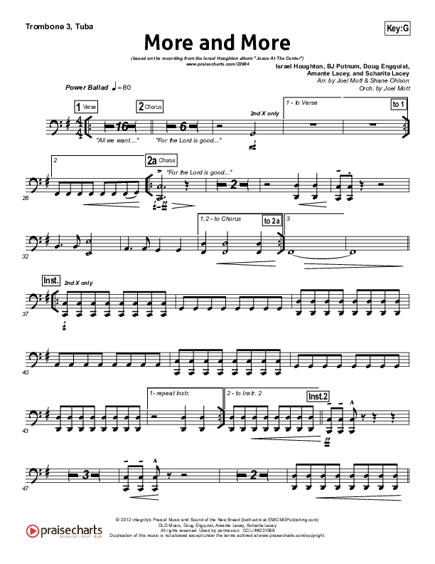Download the Trombone 3/Tuba sheet music for More And More by Israel Houghton, from the album Jesus At The Center. This song was arranged by Joel Mott / Erik Foster in the key of F, G.