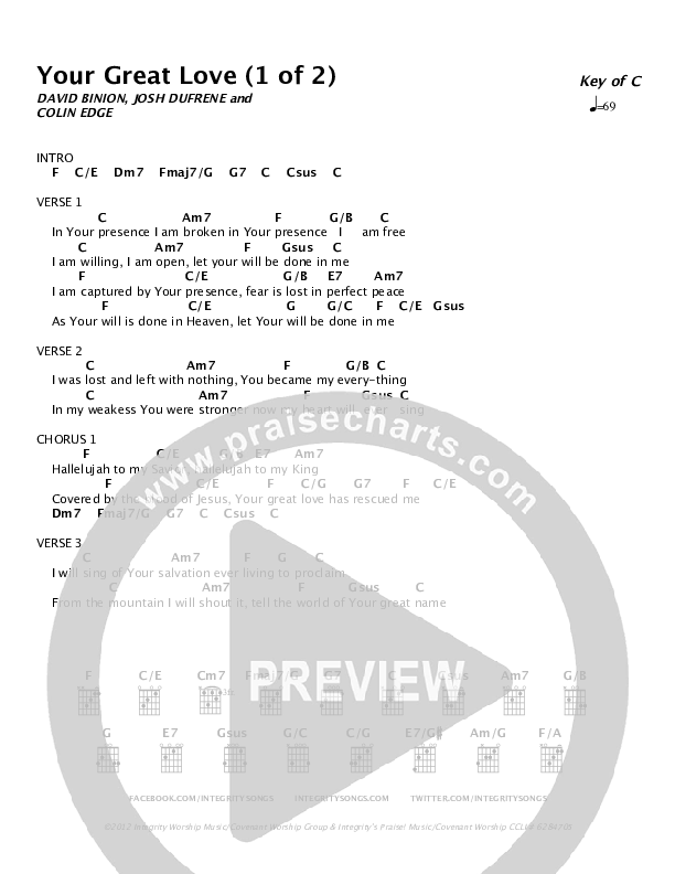 Download the PDF Chord Charts for Your Great Love by Covenant Worship, from the album Standing. This song was arranged by Integrity Music in the key of C.