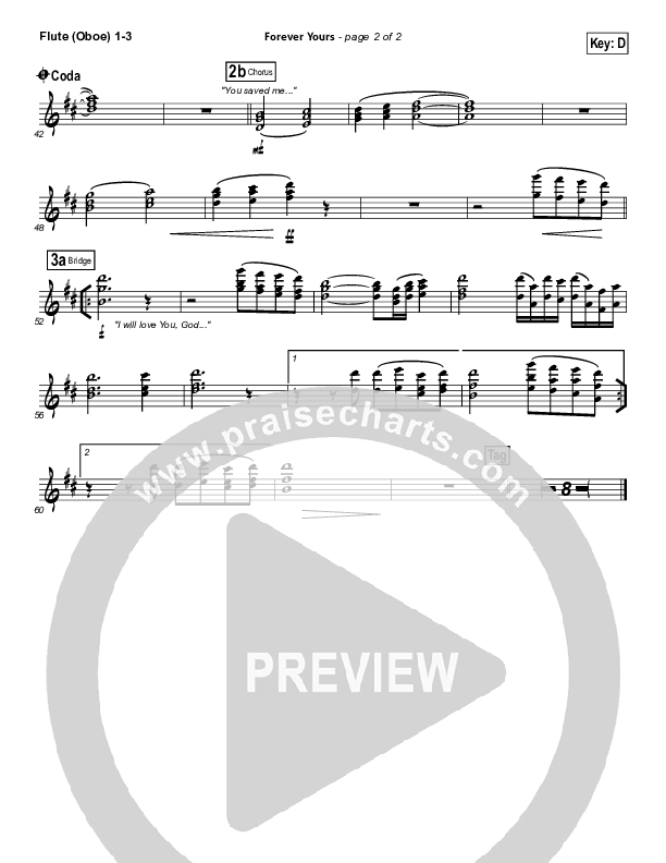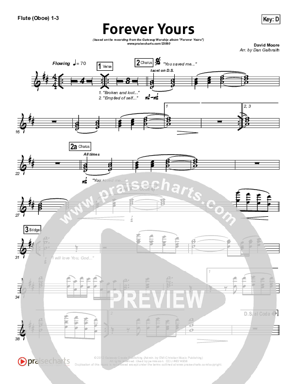 Download the Flute/Oboe sheet music for Forever Yours by Gateway Worship, from the album Forever Yours. This song was arranged by Daniel Galbraith in the key of C, D.
