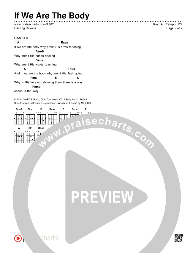 Download the PDF Chord Charts for If We Are The Body by Casting Crowns, from the album Casting Crowns. This song was arranged by John Wasson / Charlie Sinclair in the key of A, G.