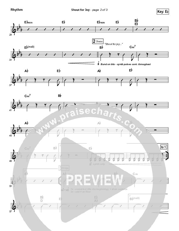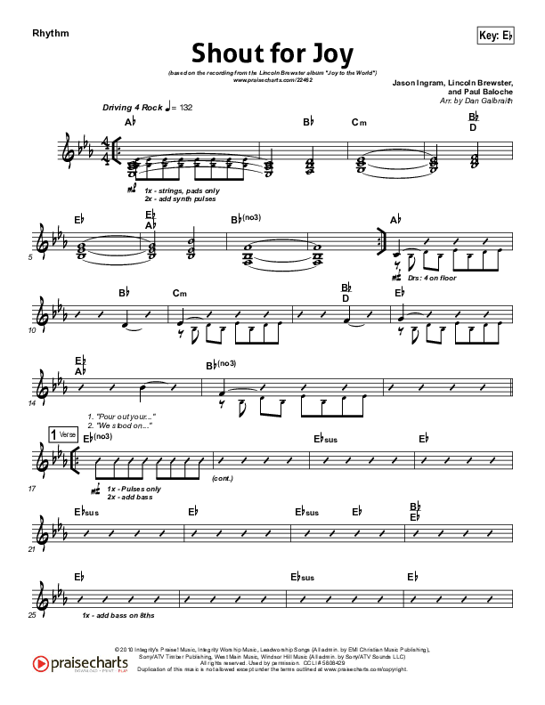 Download the Rhythm Chart for Shout For Joy by Lincoln Brewster, from the album Joy To The World. This song was arranged by Daniel Galbraith in the key of D, Eb.