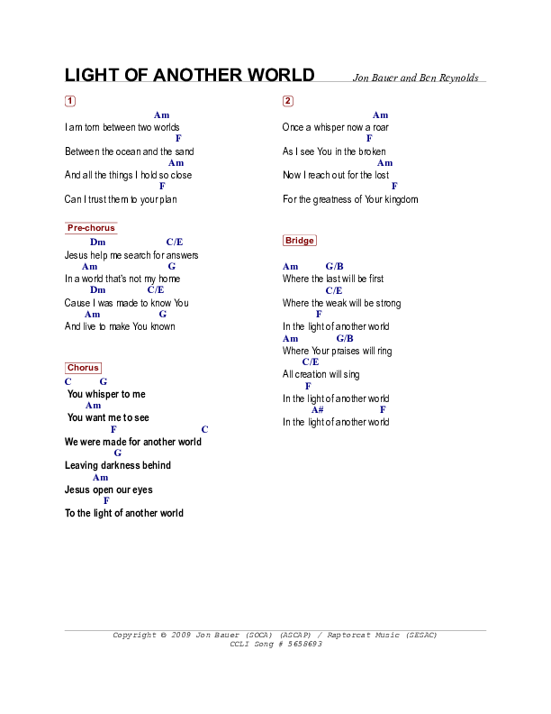 Download the PDF Chord Charts for Light Of Another World by Jon Bauer, from the album Forevermore.