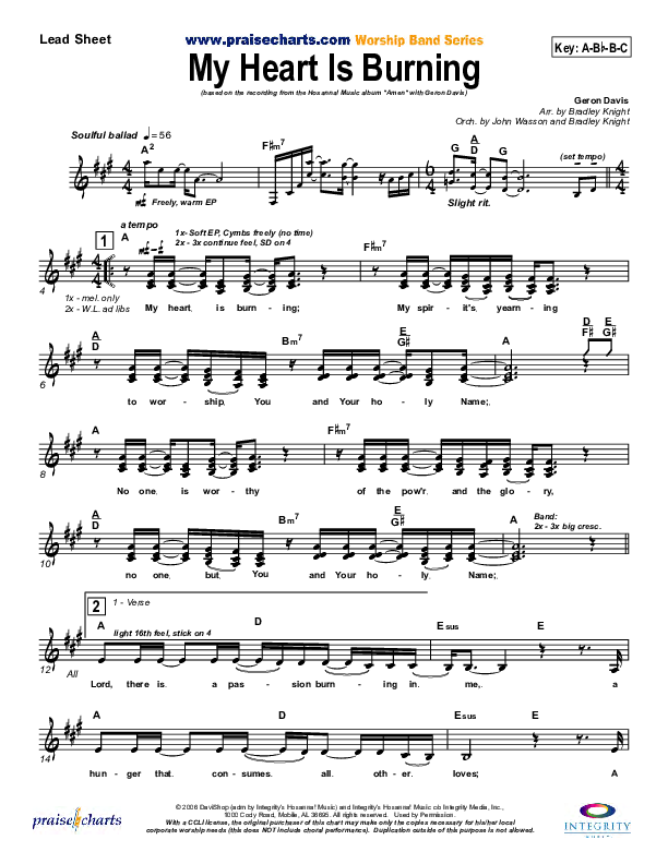 Download the sheet music for My Heart Is Burning by Geron Davis, from the album Amen. This song was arranged by John Wasson in the key of Ab.