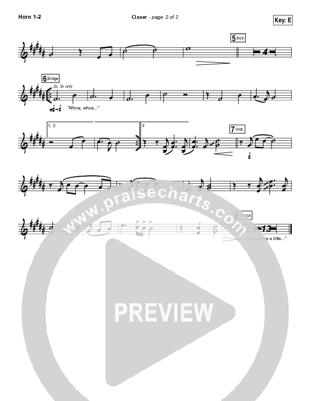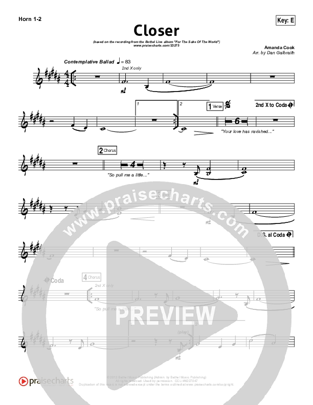 Download the French Horn sheet music for Closer by Bethel Music, from the album For The Sake Of The World. This song was arranged by Daniel Galbraith in the key of E, F.