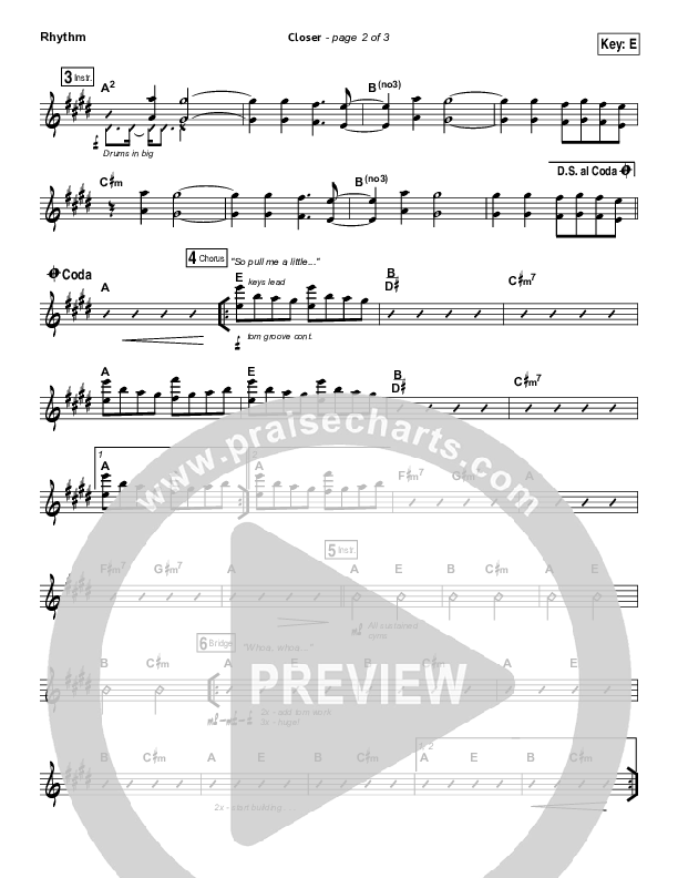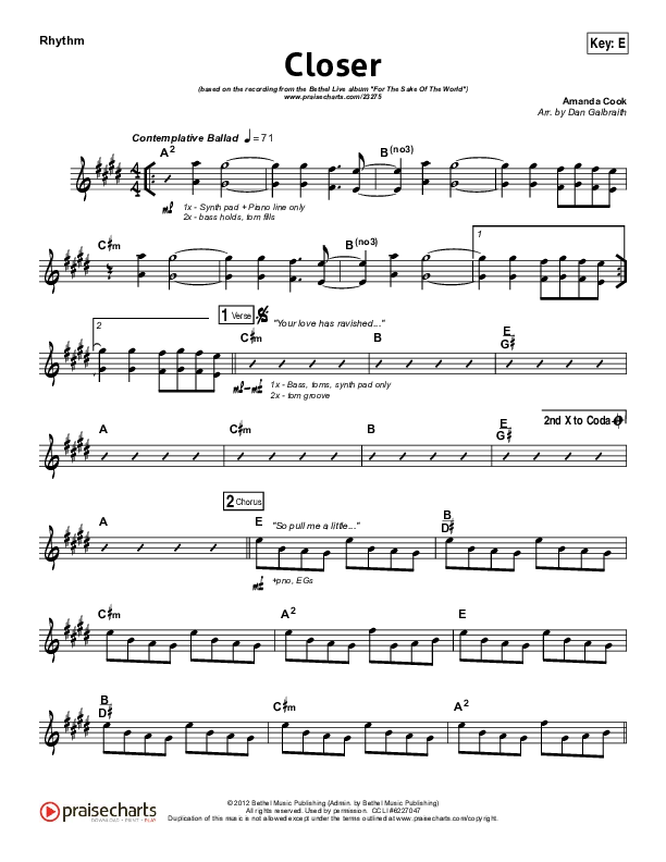 Download the Rhythm Chart for Closer by Bethel Music, from the album For The Sake Of The World. This song was arranged by Daniel Galbraith in the key of E, F.
