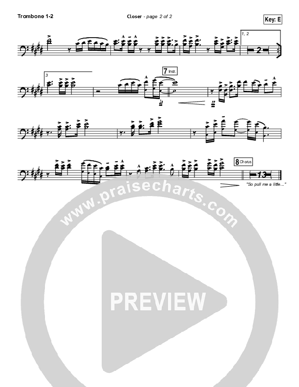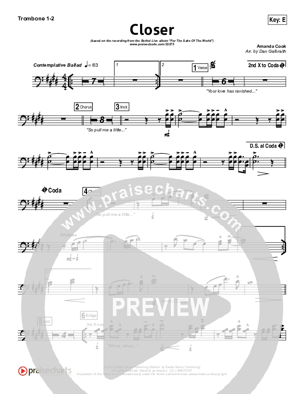 Download the Trombone 1,2 sheet music for Closer by Bethel Music, from the album For The Sake Of The World. This song was arranged by Daniel Galbraith in the key of E, F.