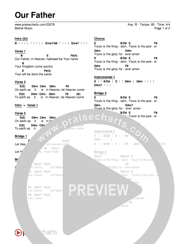 Download the PDF Chord Charts for Our Father by Bethel Music, from the album For The Sake Of The World. This song was arranged by Daniel Galbraith in the key of B, C.