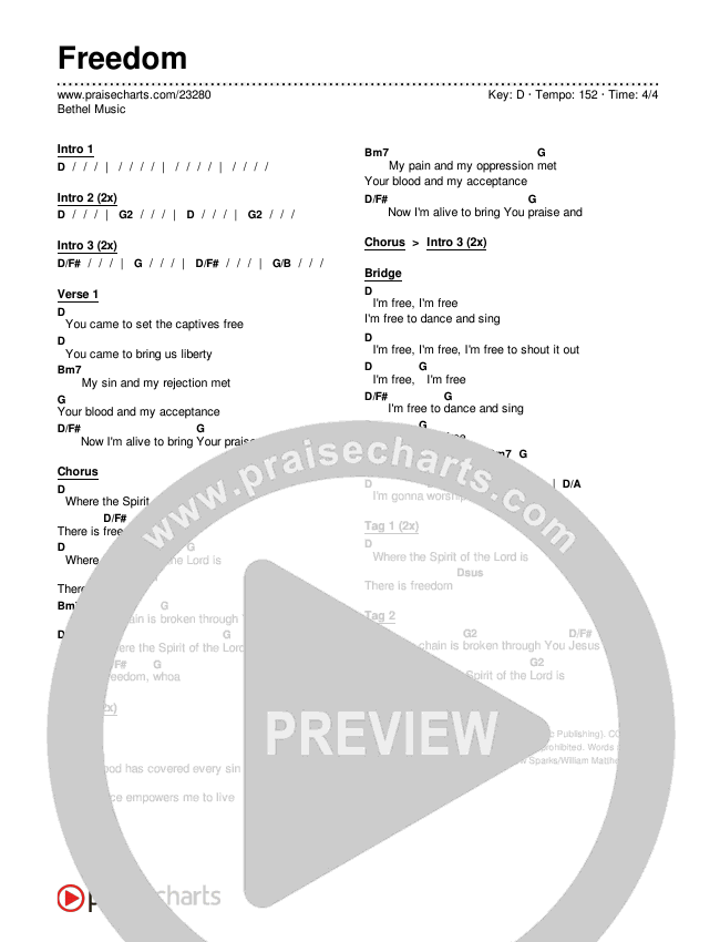 Download the PDF Chord Charts for Freedom by Bethel Music, from the album For The Sake Of The World. This song was arranged by Daniel Galbraith in the key of C, D.