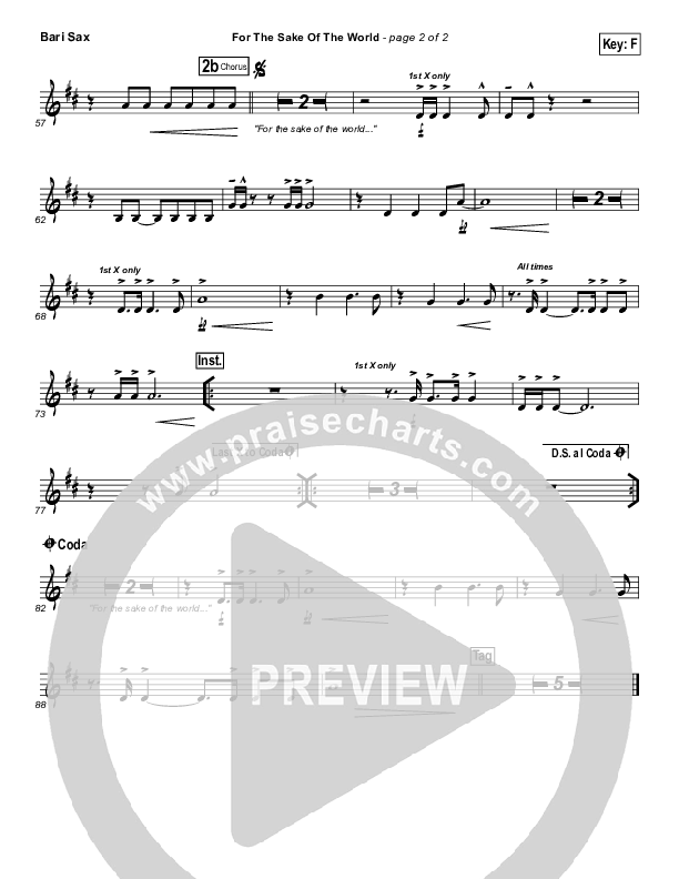 Download the Bari Sax sheet music for For The Sake Of The World by Bethel Music, from the album For The Sake Of The World. This song was arranged by Daniel Galbraith in the key of F, G, Gb.