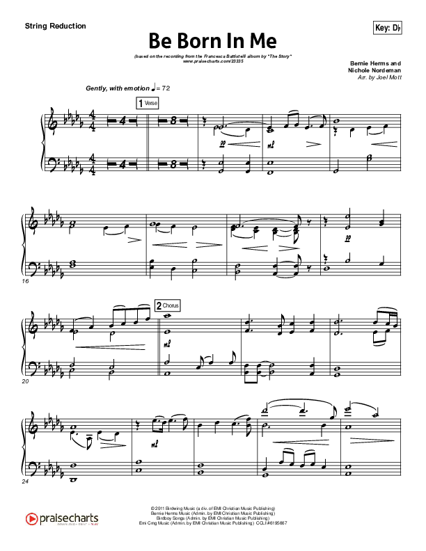 Download the Orchestration for Be Born In Me by Francesca Battistelli, from the album Music Inspired By The Story. This song was arranged by Joel Mott in the key of B, Bb, C, Db, Eb.