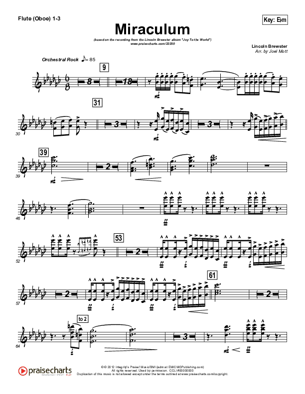 Download the Orchestration wind parts for Miraculum (Instrumental) by Lincoln Brewster, from the album Joy To The World. This song was arranged by Joel Mott in the key of Dm, Ebm.